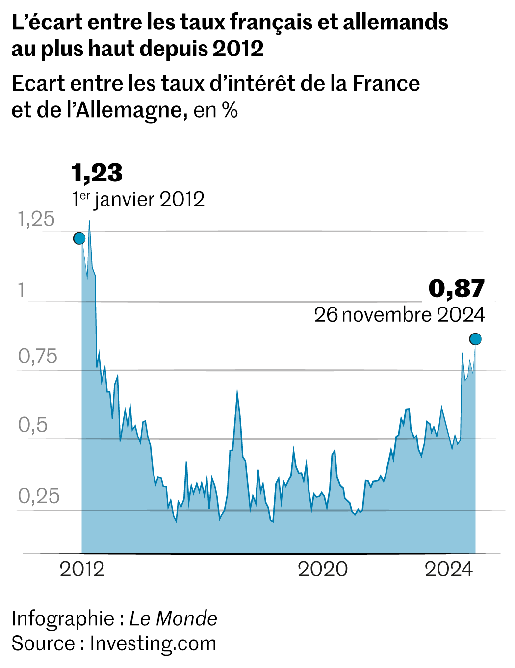 « Les marchés sont très inquiets,constate Bruno Cavalier,économiste en chef chez Oddo BHF. Redresser les comptes publics demande d’agir dans la durée. Or,Michel Barnier est déjà en sursis,et la France pourrait finir l’année sans avoir adopté de budget pour la suivante. On risque d’entrer dans un territoire inconnu,sans carte,sans plan. Les marchés mettent un prix sur ce risque,de plus en plus élevé. »