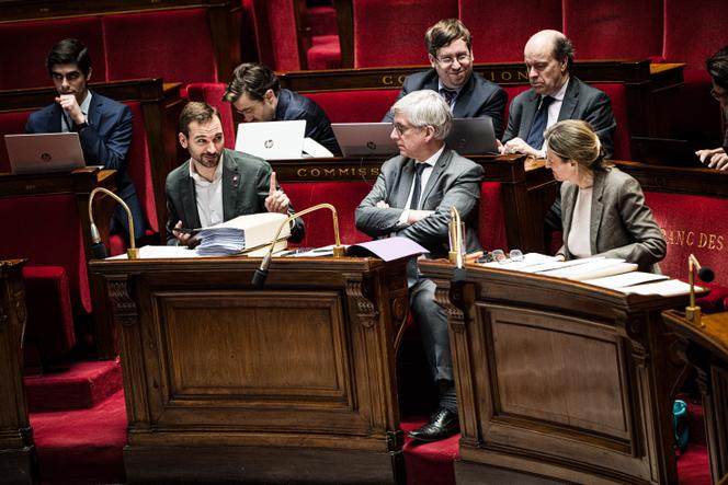 Le député Horizons et président de la commission des affaires sociales,Frédéric Valletoux,entouré d’Ugo Bernalicis,député La France insoumise (LFI) et rapporteur de la commission des affaires sociales,et de la ministre du travail et de l’emploi,Astrid Panosyan-Bouvet,lors de l’étude de la proposition de loi d’abrogation de la retraite à 64 ans,à l’Assemblée nationale,le 28 novembre 2024. JULIEN MUGUET POUR « LE MONDE » Sauf coup de théâtre,c’est le dernier mot du gouvernement. Lundi 2 décembre,la version finale du projet de loi de financement de la Sécurité sociale (PLFSS) pour 2025 devait être soumise à l’Assemblée nationale. N’ayant pas la majorité absolue au Palais-Bourbon,le premier ministre,Michel Barnier,avait indiqué que,à cette occasion,il recourrait « probablement » à l’article 49.3 de la Constitution,qui permet l’adoption d’un texte sans vote. Une telle procédure l’expose à une motion de censure de la part des députés du Nouveau Front populaire et du Rassemblement national (RN),ces deux forces politiques étant très critiques sur le contenu du budget de la « Sécu ».