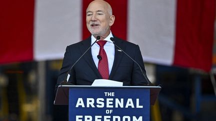 Le PDG de Blue Origin,Jeff Bezos,prend la parole sur scène à Cap Canaveral,en Floride (Etats-Unis),le 2 février 2026. (MIGUEL J. RODRIGUEZ CARRILLO )