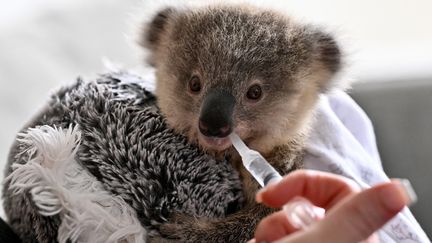 Un bébé koala agrippe un jouet en peluche pendant son repas à Sydney,le 4 octobre 2024. (SAEED KHAN )